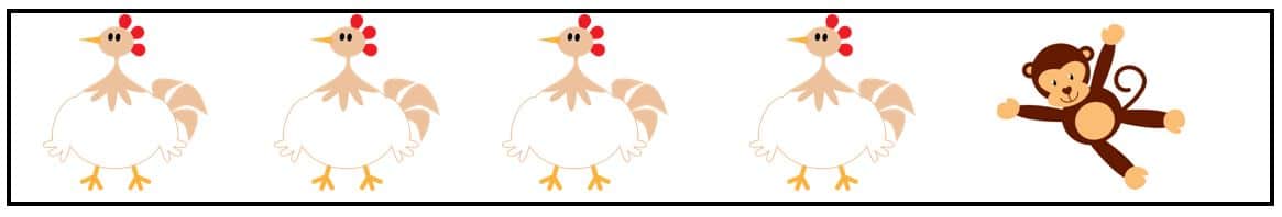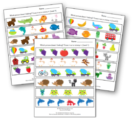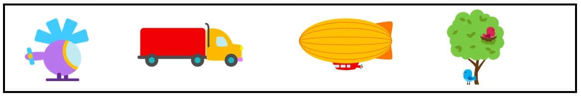 第三级:这些更具挑战性。您的孩子需要考虑什么种类每一项所代表的事物。除了一个,他们都是食物吗?除了一只,它们都是动物吗?或者,在上面的例子中,除了一个以外,它们都是可以带你去的地方吗?